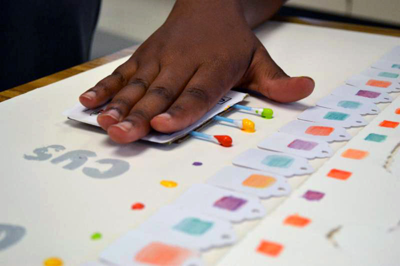 Students create the second panel of a 3-panel art project that illustrates the process of how DNA is transcribed into RNA code.