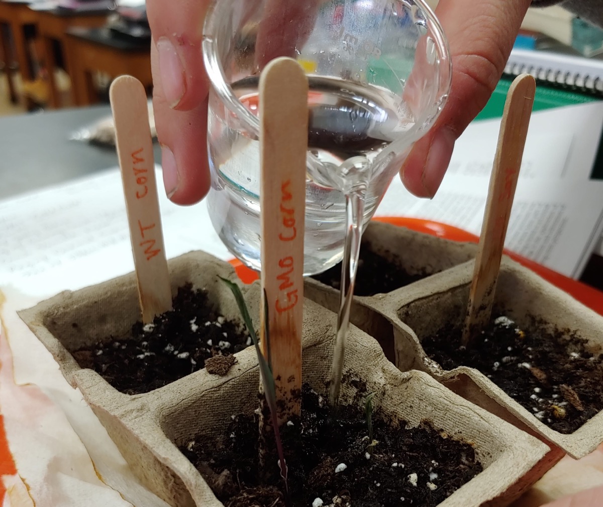In the Genetically Modified Plants lab, students grew GM soybean seeds and corn and compared them to wild type (WT) soybeans and corn. Students are observing and analyzing the growth and quality of the different types of plants.