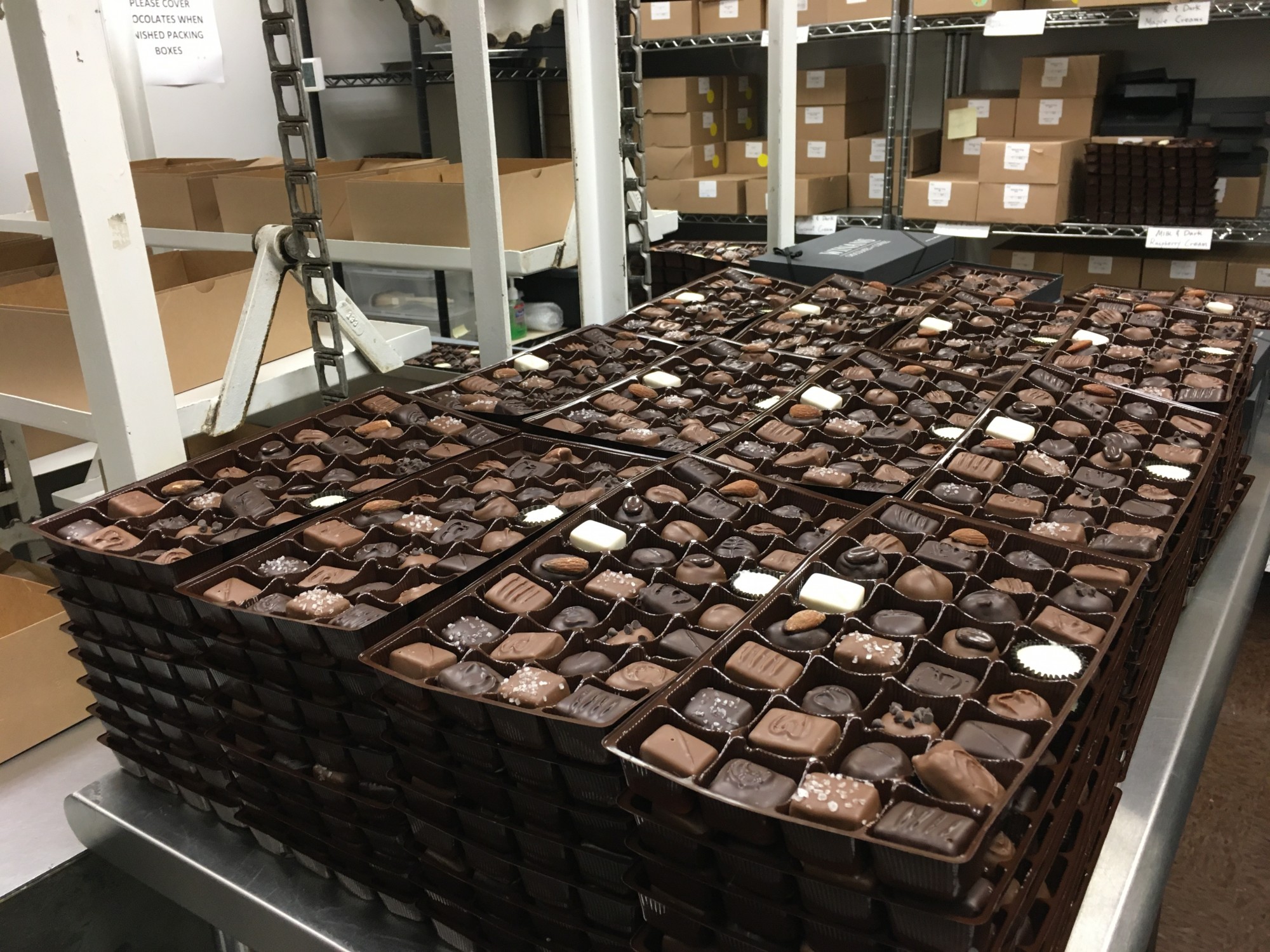 While watching the enrobing line in action, Snyder explained the use of lecithin and the tempering process. Food science at its best! “Lecithin is used an emulsifier to keep the butter from separating, to allow the product to be poured and keep shape on our tables. Each morning we go through a process of lowering the temperature of the chocolate quickly, then raising it back up to the correct temperature to work with. We have to maintain the temperature throughout the day. We run about 500 pounds of finished product per line each day, so we are constantly adding in untempered warm chocolate to the enrobing lines. We want to align the crystals in the chocolate so it is glossy and not out of temper.”