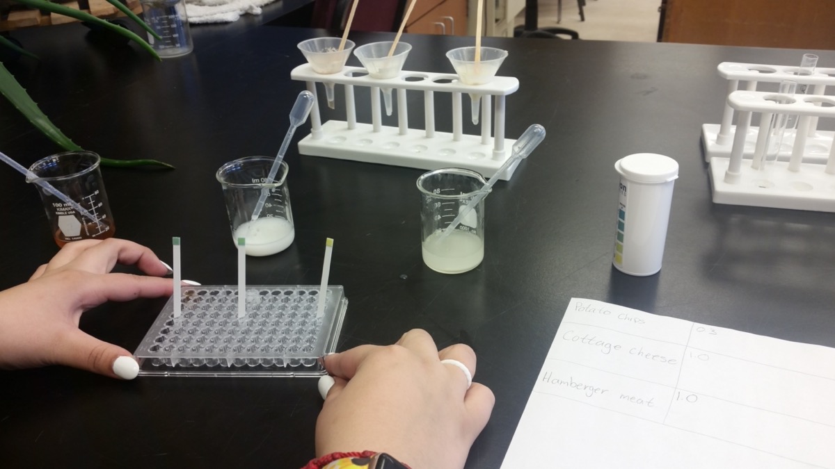 “Once she felt comfortable with the lab tools, we moved on to collecting filtrates from our samples of potato chips. Then we did the protein testing using the test strip,” Foulkes said.