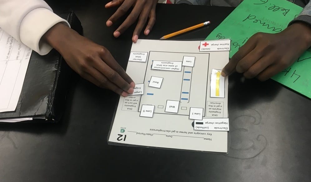 Mitchell used the gel electrophoresis basics worksheet to prepare her students prior to doing the actual DNA electrophoresis. “The velcro worksheet helped students understand what would be going on when we ran the gel. Since our bells are slightly under 50 minutes long, it is imperative that students come in with a good understanding of what is going on so they can finish in the time we have. This year the students were much more prepared and were able to run the gels and get separation in one class period. I attribute this to using the paper and velcro copy provided by GrowNextGen. The paper model also allowed students that lack the maturity to run their own gel to have a better understanding when we ran a demonstration electrophoresis gel together as a class. Given the time crunch we have to get everything finished before testing begins, I found the activities that I received from GrowNextGen to be clear and concise and easily adaptable to my classroom structure. This helped students understand not only DNA fingerprinting but also the many related areas of biotechnology.”