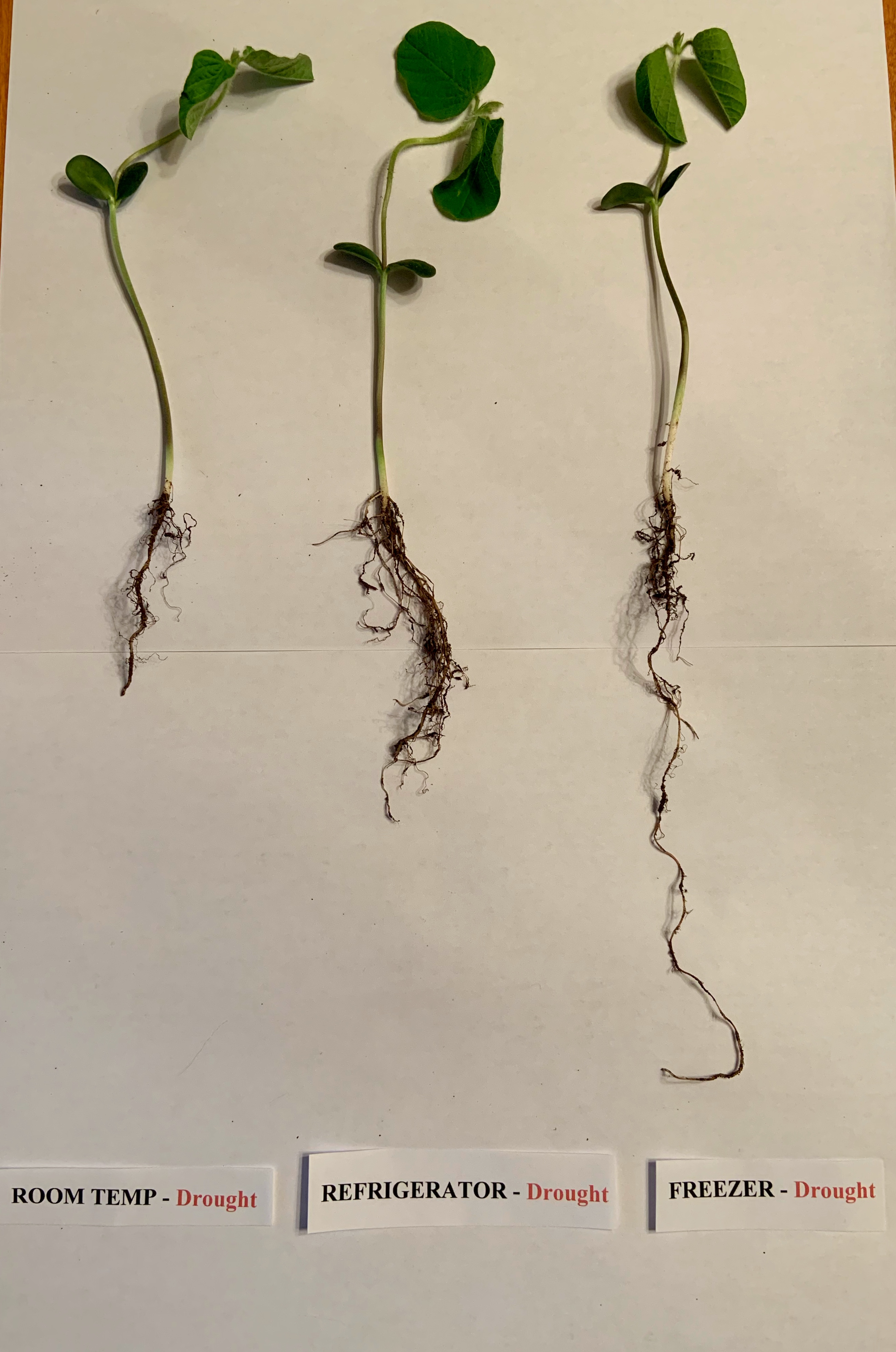 Soybean seeds were stored in tins in either the “Refrigerator”, “Freezer” or at “Room Temperature”. After seven days the seeds were grown in plastic planters using a grow light in either non-drought conditions with the ideal amount of water or simulated in drought conditions which lacked water. After 12 days of growth, the plants were dug up. The vigor index was recorded. Three trials were performed.